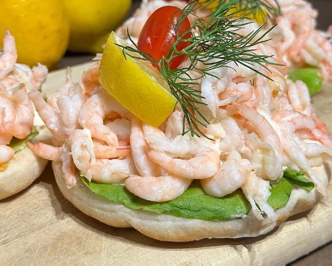 Välj räk- eller köttbullemacka på vete. Du kan även beställa glutenfri eller råg.